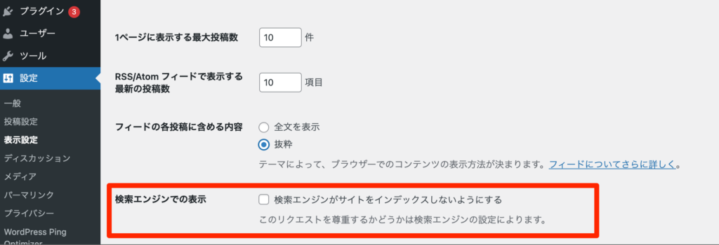 3. 「検索エンジンでの表示」のチェックは外しておきましょう。
